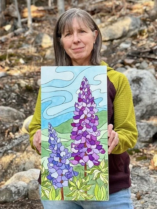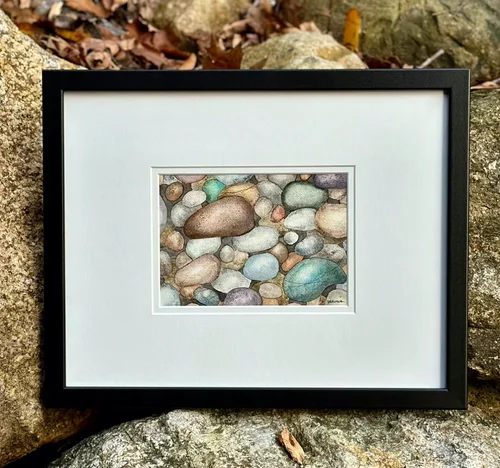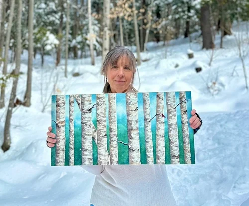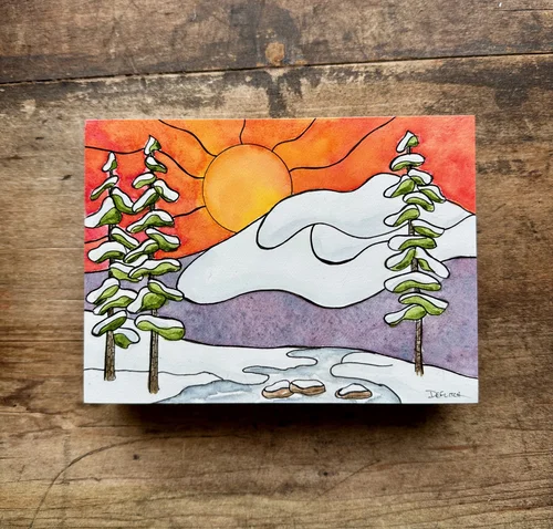 Created on thick 400# Arches paper, painted directly on Ampersand Aquabords, or created on Arches paper then adhered to boards, each are waxed & varnished for added protection. Bright and colorful - using gouache or watercolors - they are a wonderful way to own and enjoy original art. Wooden display easel included.
