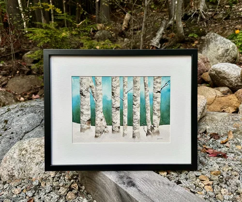 8” x 10” original watercolor recreating a family’s log cabin in Jackson, NH